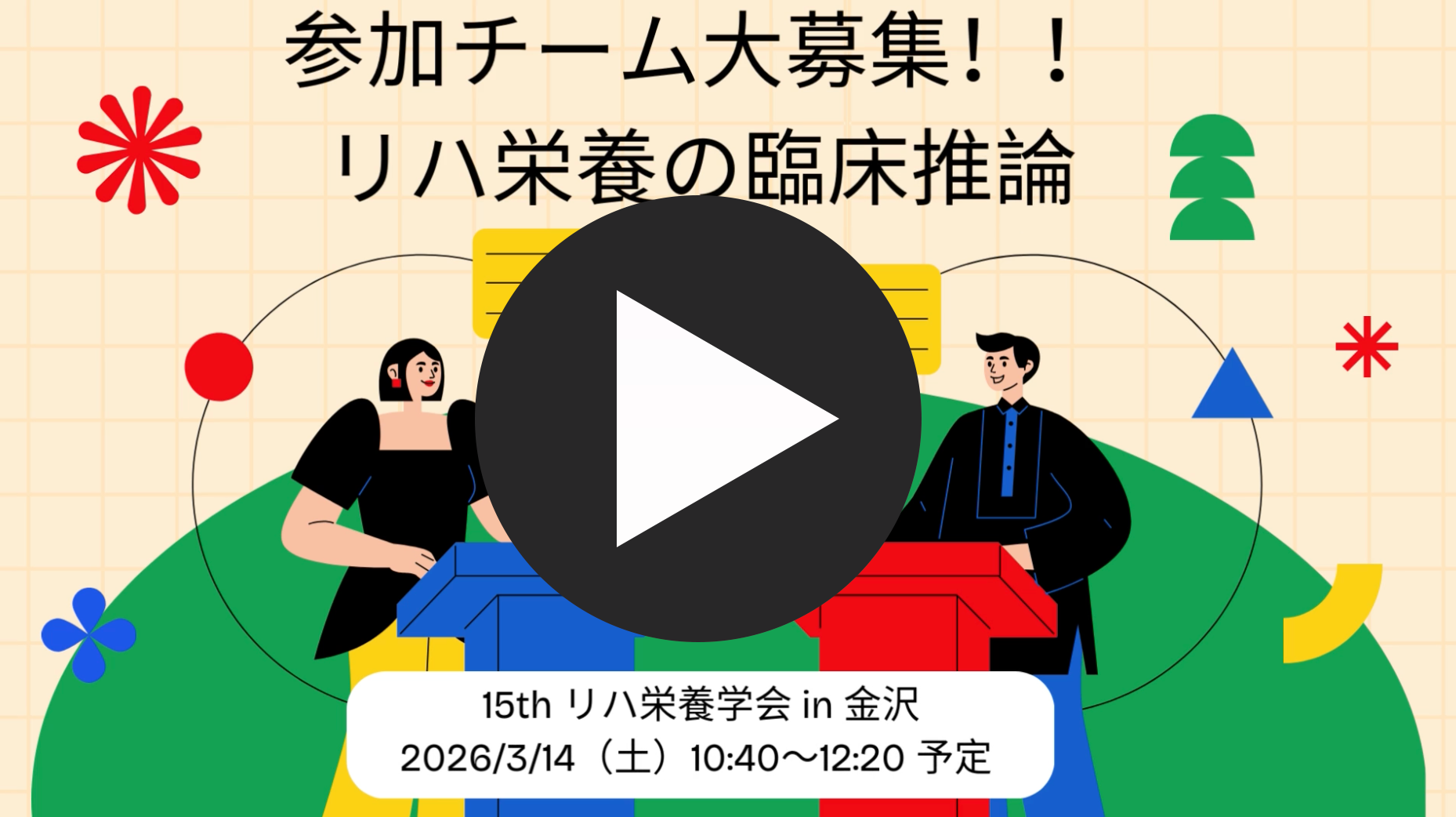 本企画は、多職種チームによる症例の臨床推論を通じて、リハビリテーション栄養の実践力とチーム連携力を高めることを目的としたセッションです。提示された症例に対し、チームごとに診断推論・介入方針・予後予測を議論・発表していただきます。1チームは2職種以上で構成し、原則として同一施設内での編成を推奨しますが、多施設混成チームも可とします。応募多数の場合は、同一施設チームを優先して選考します。リハ栄養のチーム活動を実践されている皆様のご参加をお待ちしています。